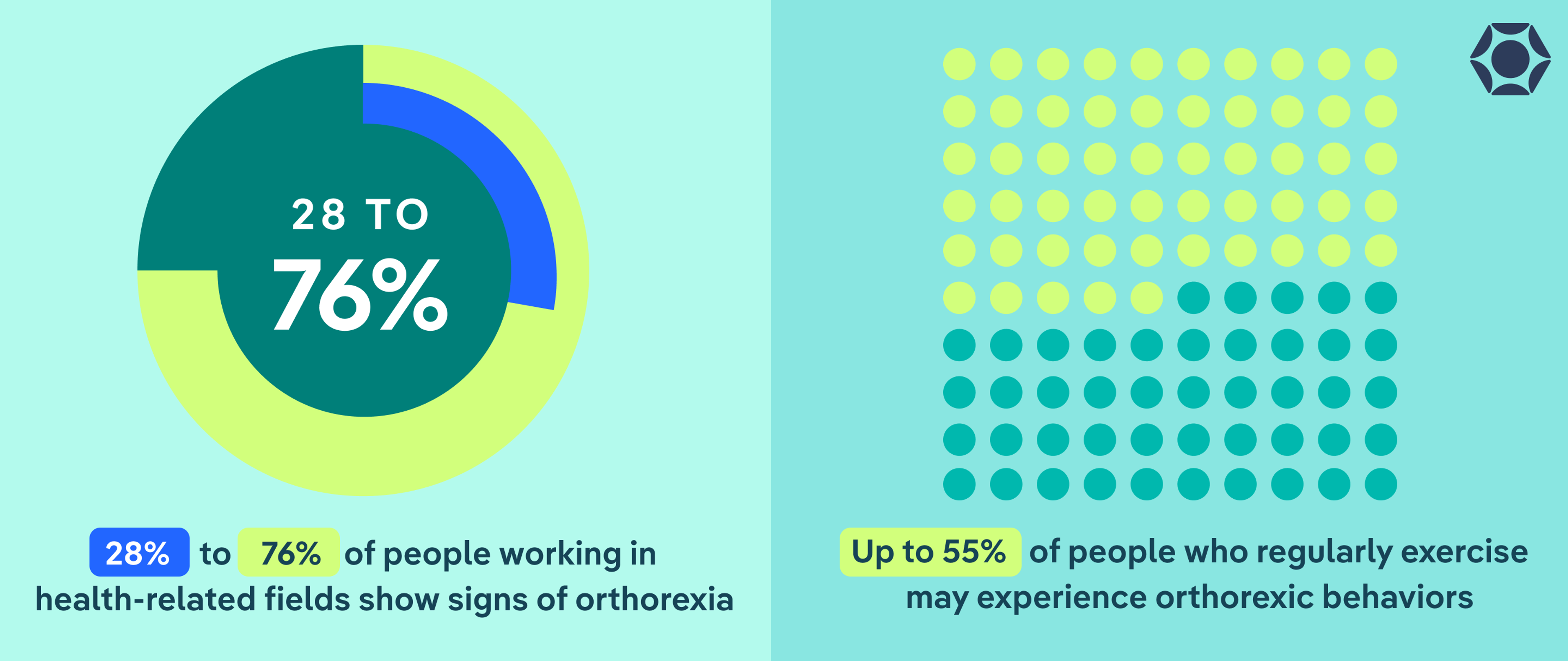 While estimates vary, orthorexia is thought to affect up to about 7% of the population—and it appears even more common in health- and fitness-focused spaces, like some competitive athletics, fitness studios, and weight loss-focused social media accounts. Studies suggest that 28% to 76% of people working in health-related fields show signs of orthorexia, and up to 55% of regular exercisers (think: athletes, weightlifters, CrossFitters, and runners)may experience orthorexic behaviors.