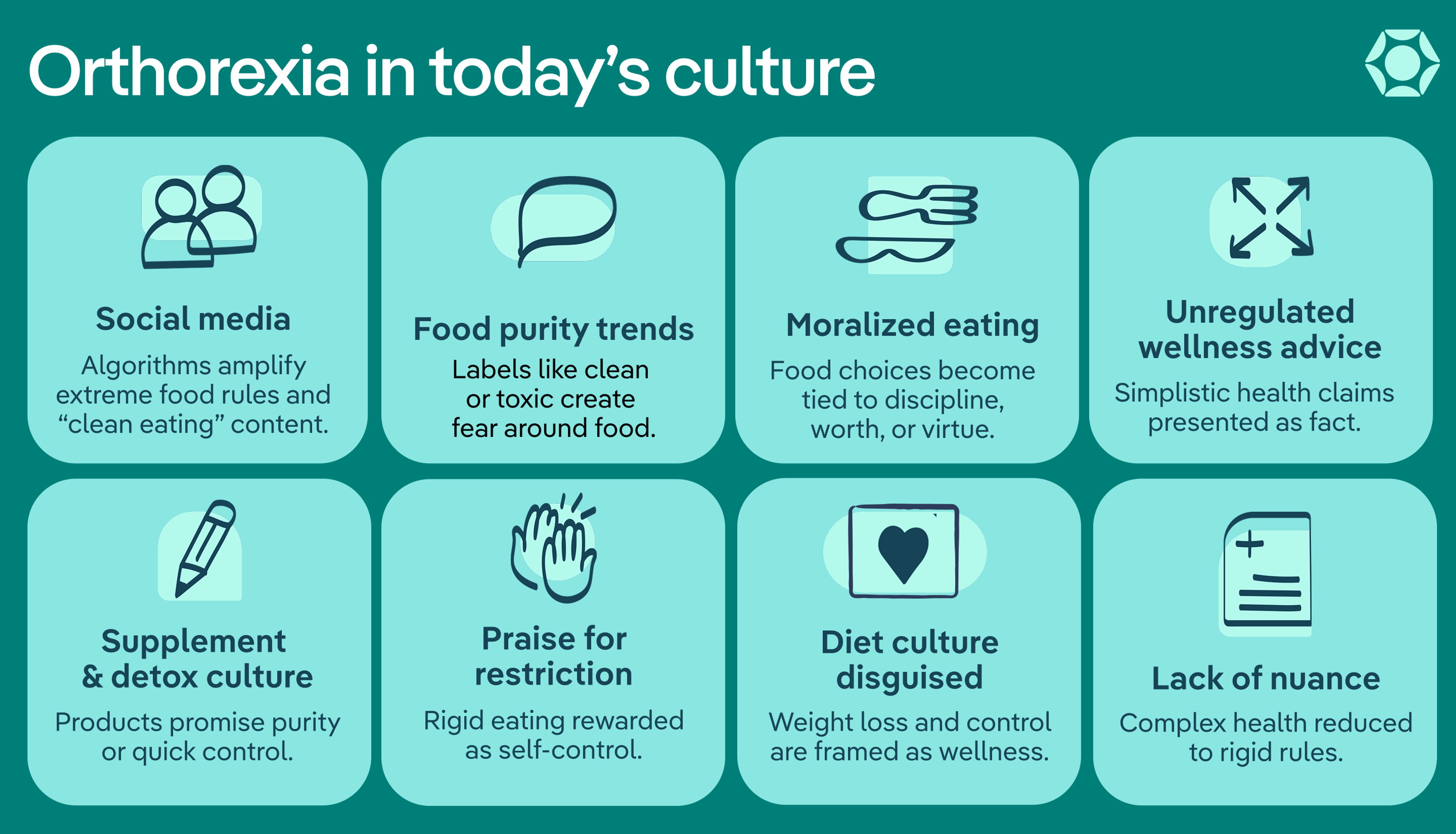 - Diet culture, wellness trends, and social media can make orthorexia hard to recognize and even harder to question, since rigid food rules are often praised.