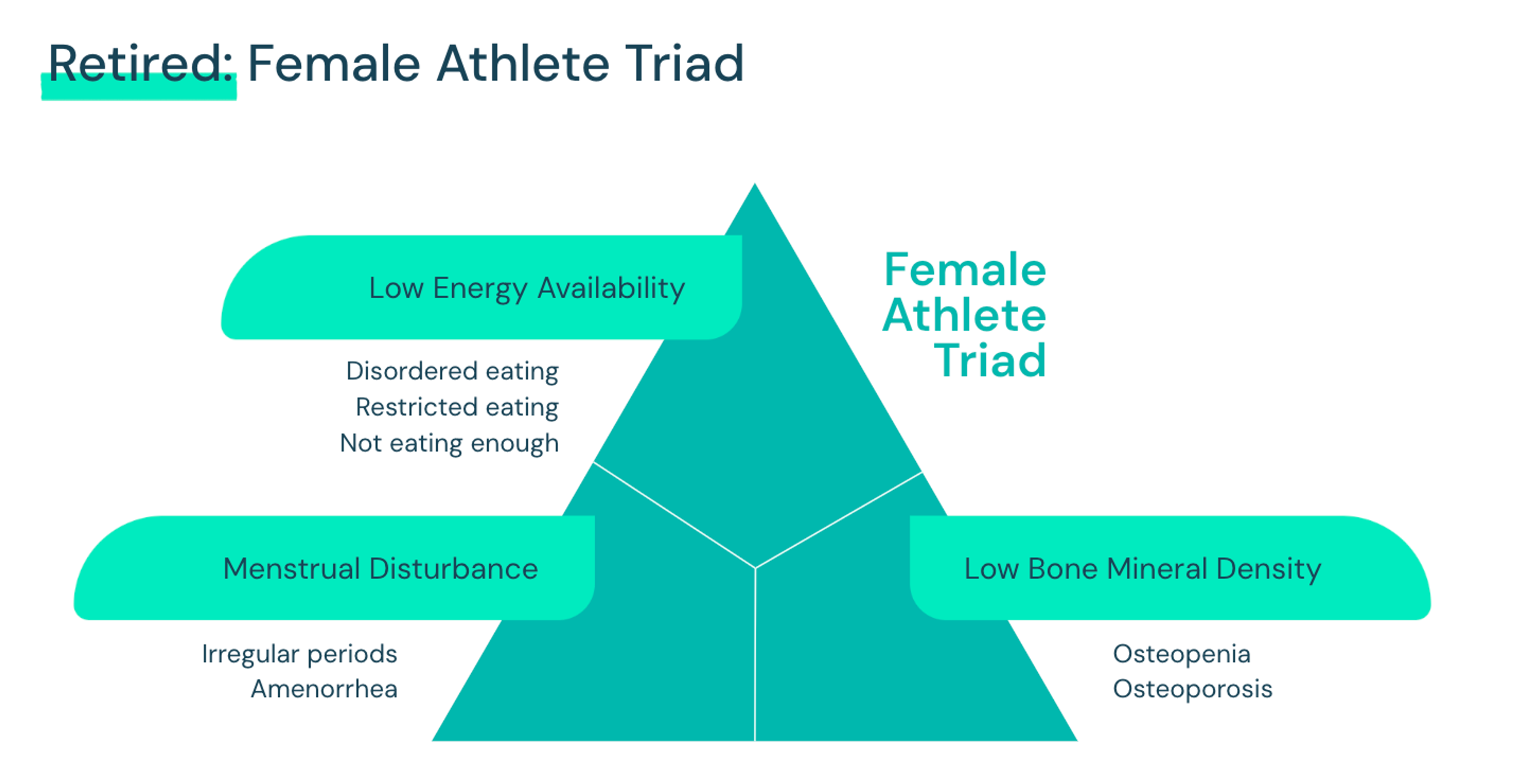 The below diagram is of the retired “female athlete triad”, which was limited to just females being flagged. The Triad at one point in history described the combination of disordered eating, amenorrhea, and early-onset bone loss (noted here as: osteopenia or osteoporosis). The latter two components (loss of menses and osteopenia/osteoporosis) are the body’s response to underfueling.