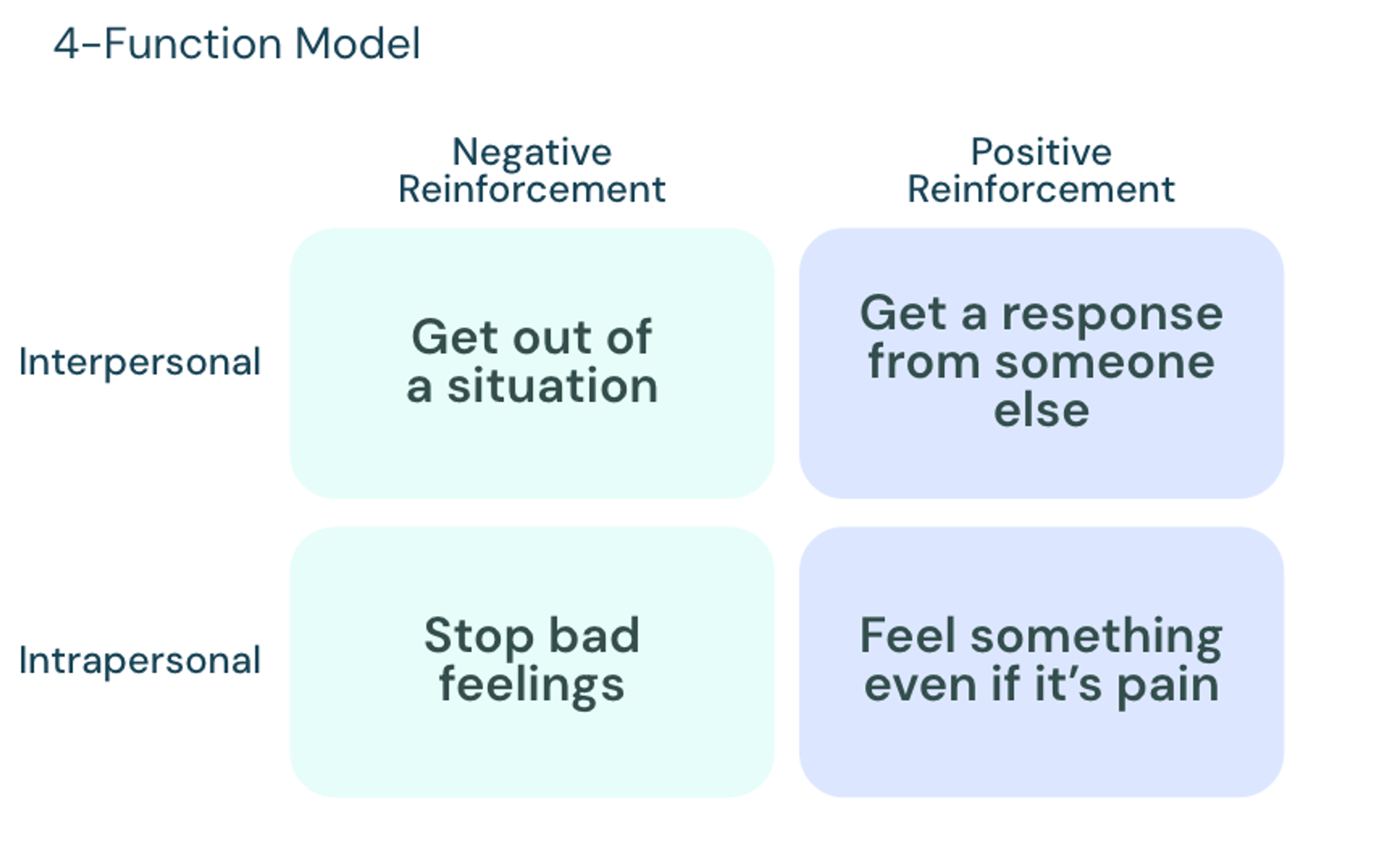 There are several different ways to understand the overlap between NSSI and eating disorders. One way to think about it is through the four-function model of NSSI, a framework which hypothesizes that NSSI is maintained by four different reinforcing processes: interpersonal negative reinforcement, interpersonal positive reinforcement, intrapersonal negative reinforcement, and intrapersonal positive reinforcement.