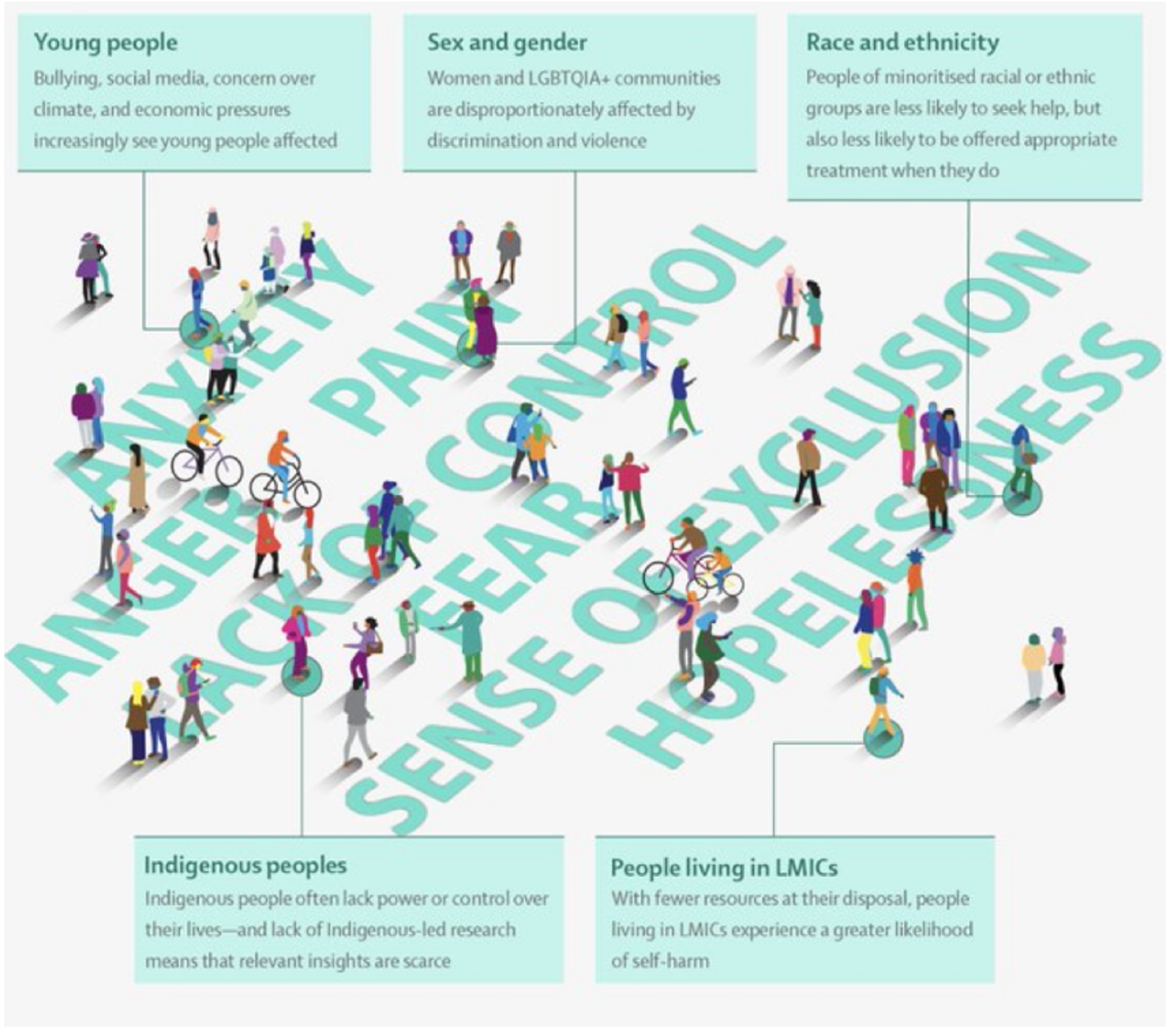 NSSI must be understood as an individual experience that occurs in an interpersonal, community, and societal context. Different factors can contribute to NSSI in different populations and demographics, as illustrated by the graphic below.