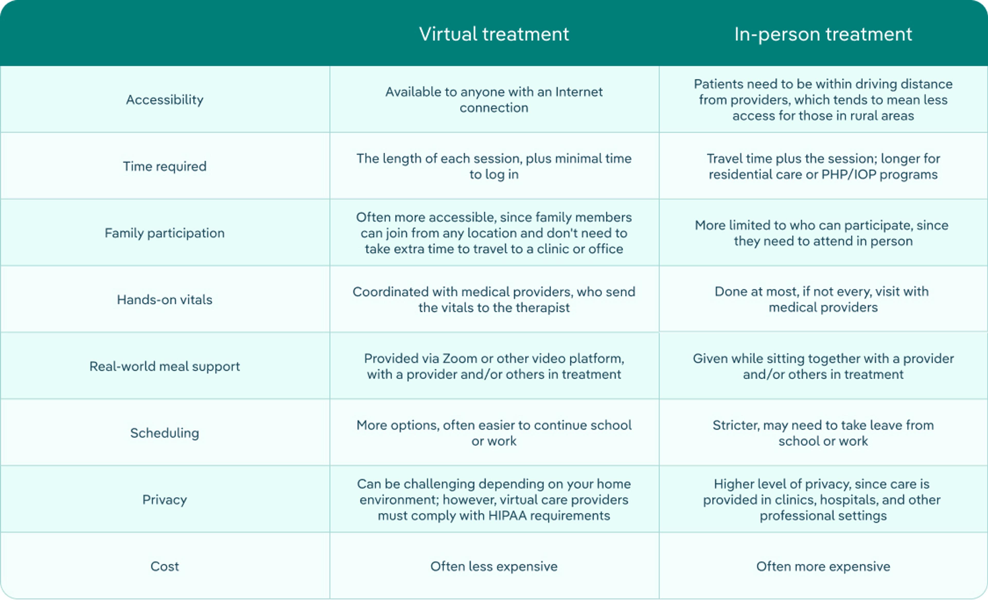 Both virtual eating disorder treatment and in-person eating disorder treatment have advantages and disadvantages. This table can help you compare the two. (Keep in mind: every program is unique; this is a general comparison.)