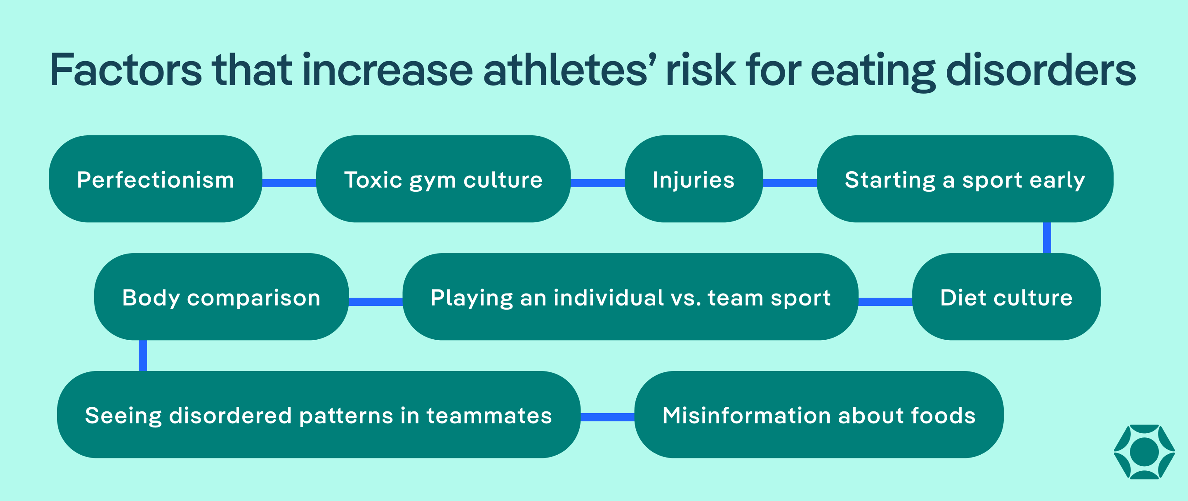 - Starting a sport early: Specializing in a single sport early in life increases someone’s risk for developing an eating disorder. This may be due to the pressure to maintain a specific look or weight for your sport early on.