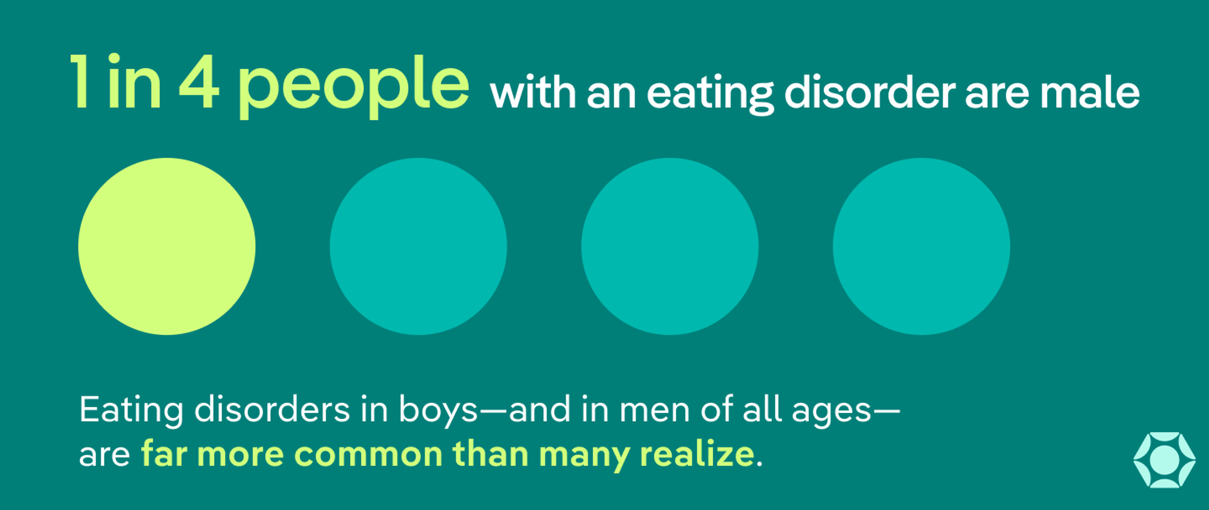 Eating disorders in boys—or boys and men of any age—are not uncommon. Despite the misconception that eating disorders mainly affect girls, research suggests at least 1 in 4 people with an eating disorder are male. But the number may be higher due to how many boys go undiagnosed. We also know that rates of eating disorders in males are increasing at a faster rate than in females. However, eating disorders in males and females can look different, which is one reason they are typically underrecognized.