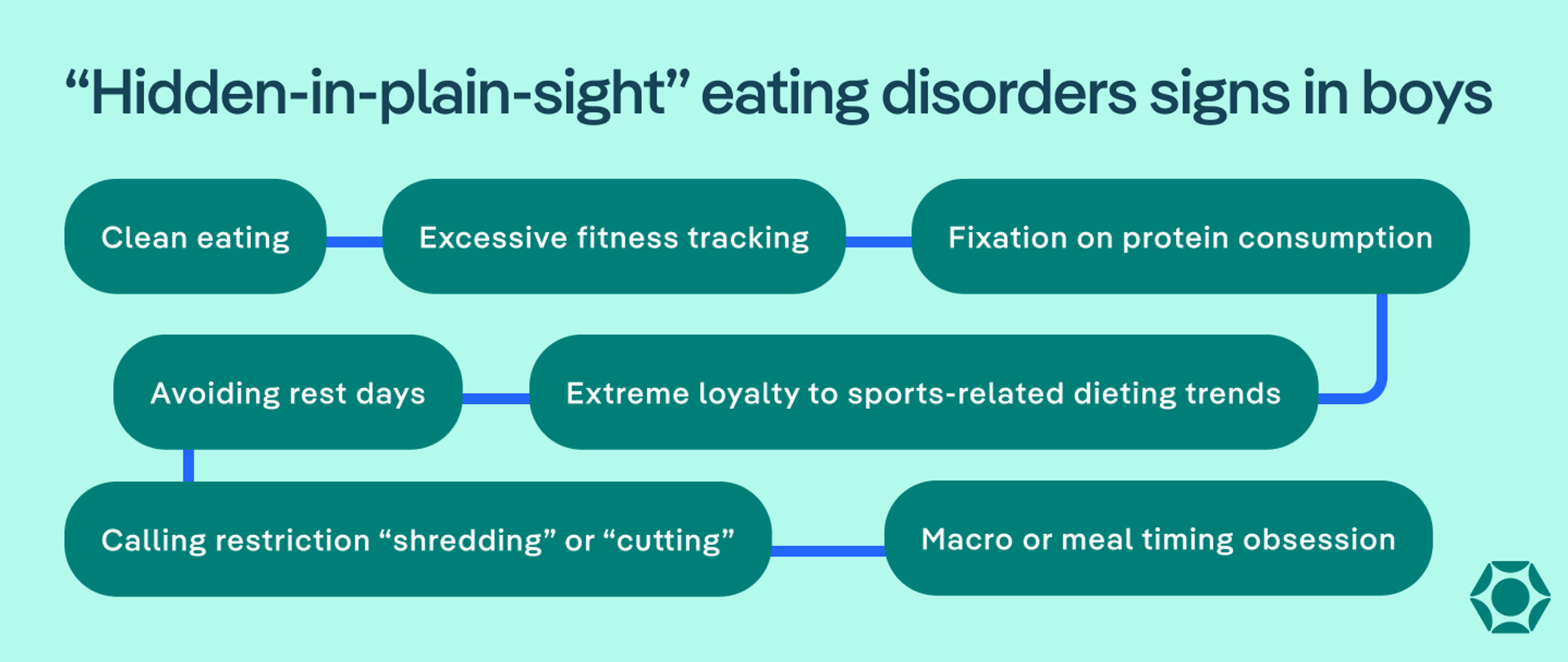 | Hidden signs | Muscle dysmorphia, performance-enhancing aids, excessive exercise, “clean” eating, protein fixation | Body checking, calorie counting rituals, dramatic food rule changes |