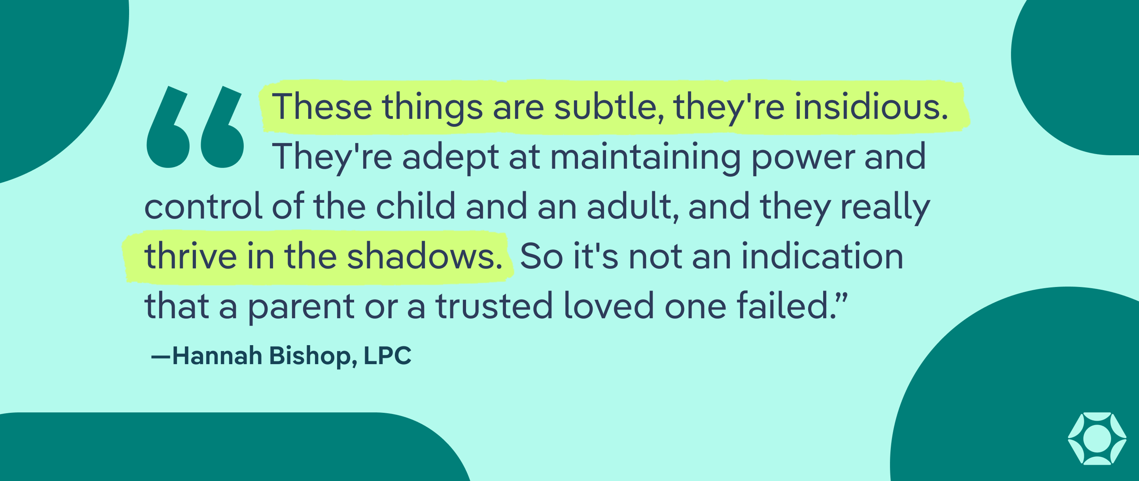 “Most parents I meet with are often like, how could I miss this? How did I not know this was happening?” Levine adds. “These things are subtle, they're insidious. They're adept at maintaining power and control of the child and an adult, and they really thrive in the shadows. So it's not an indication that a parent or a trusted loved one failed.”
