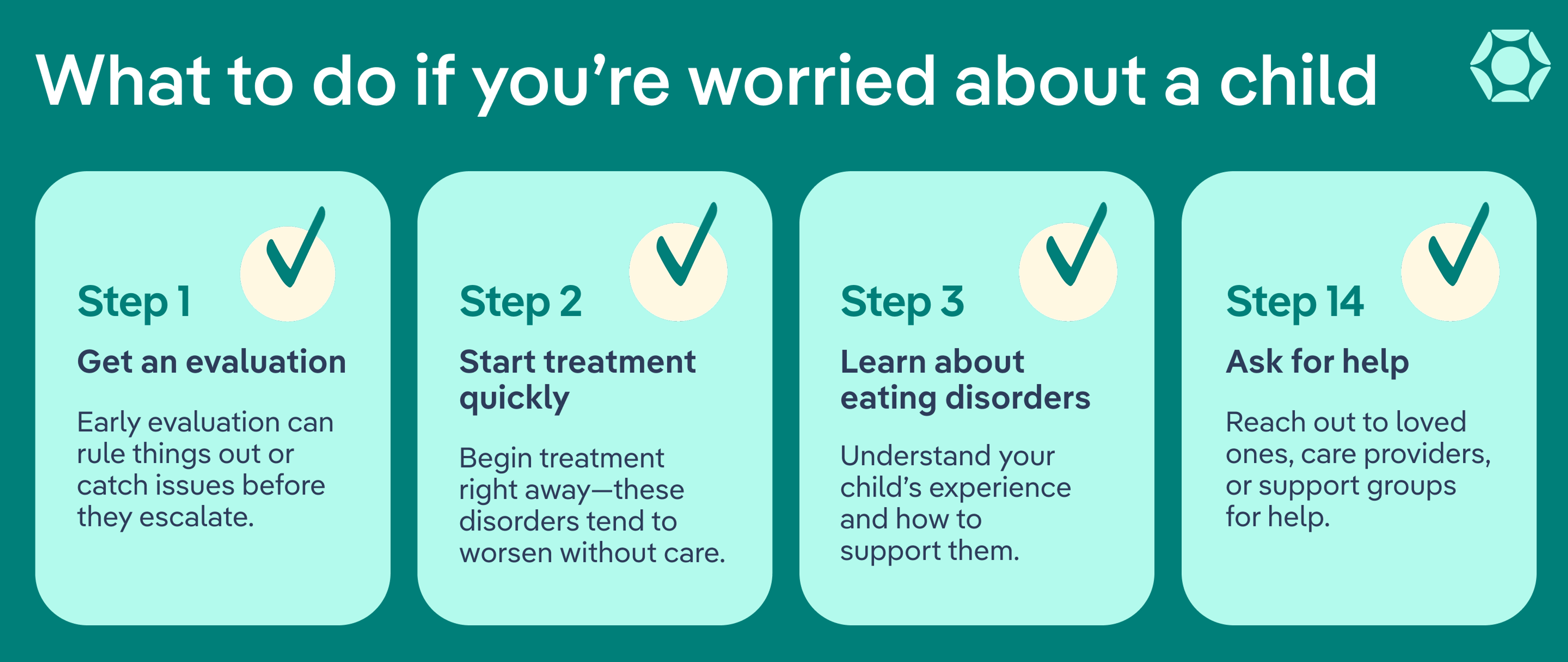 “Educate yourself about eating disorders and identify how to help,” Poynter says. This can help you feel more empowered on the journey to get your child well.
