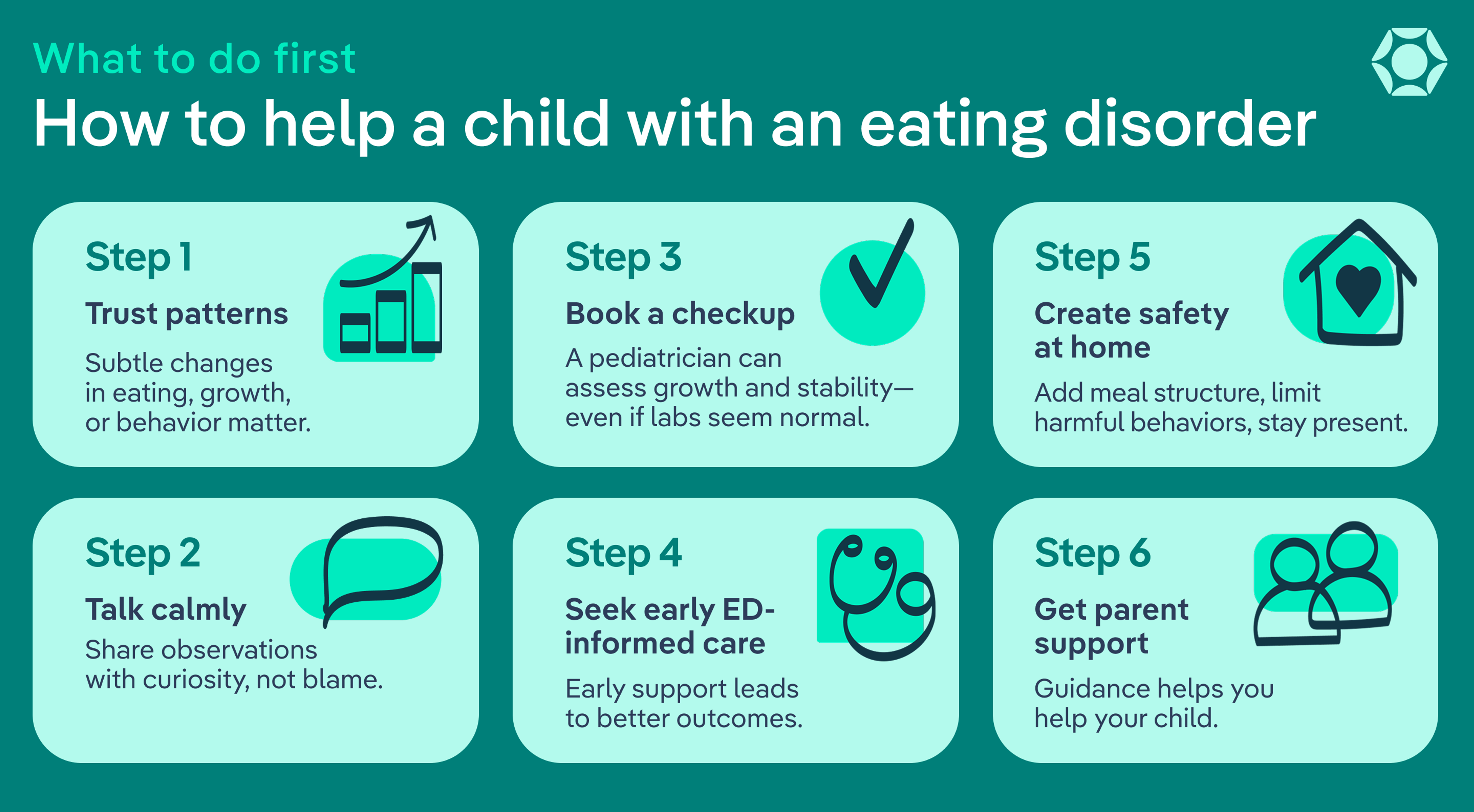 Start by trusting your concern. Notice patterns over time, have a calm conversation with your child about what you’ve observed, and schedule a medical checkup to assess growth and safety. You don’t need a diagnosis to seek eating-disorder–informed care, and early support leads to better outcomes.
