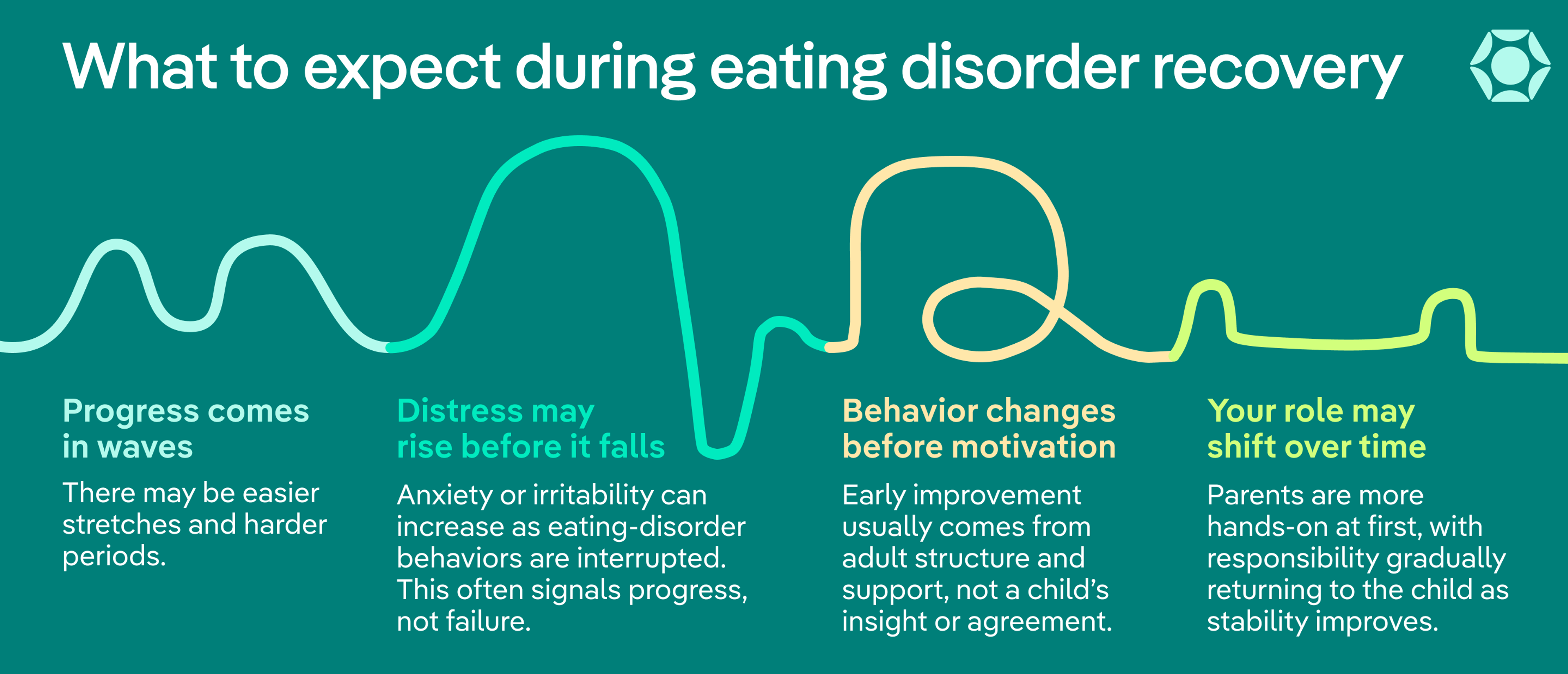 - Emotional distress can increase before it improves: As nutrition is restored and eating-disorder behaviors are interrupted, children may feel more anxious, irritable, or overwhelmed at first. This can be a sign that the eating disorder is losing control, not gaining it.
