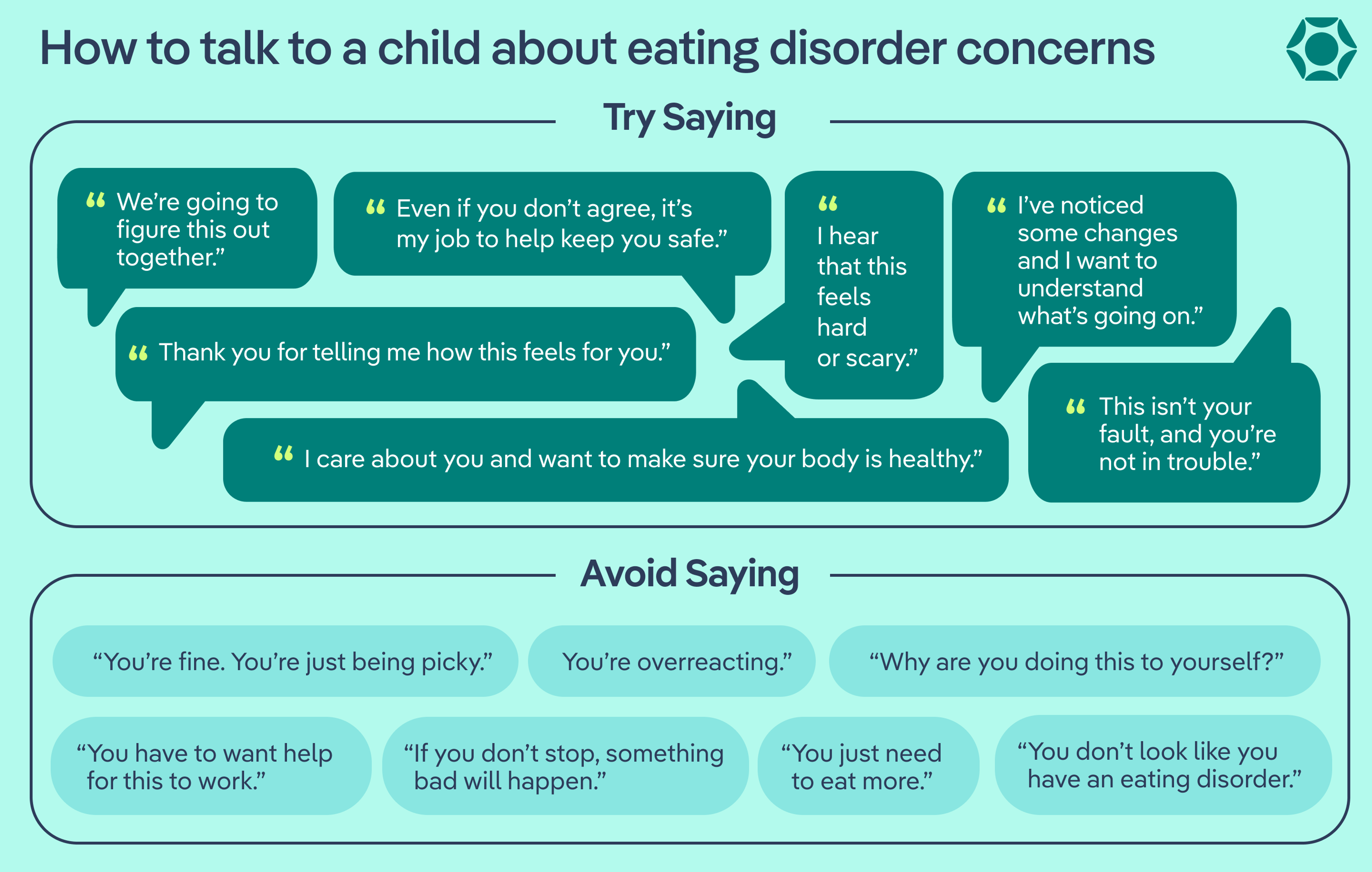 - Focus on support, not debate: You don’t need to argue with eating-disorder thoughts or convince your child. Prioritize safety and nourishment.